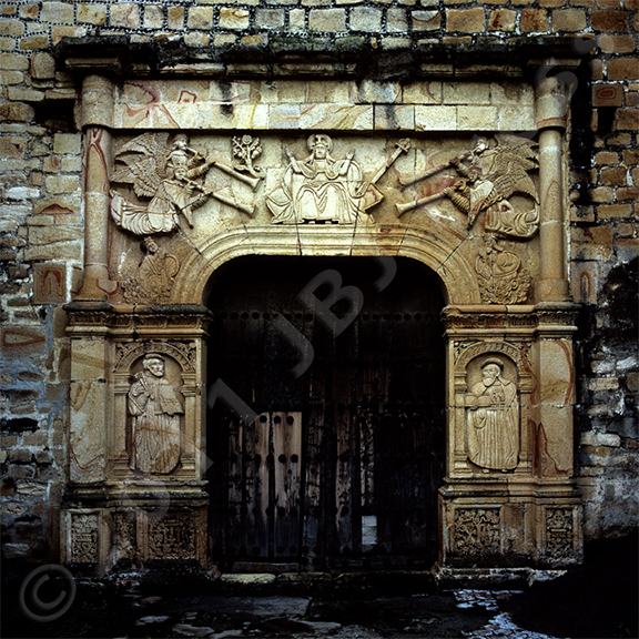 The north door of the former monastery of Saint Martin (San Martín) is an example of the “cookie-cutter style” popular in sixteenth century Mexico. Above the door Christ sits triumphant, flanked by a flowering bush and a sword, symbols of compassion and divine power as well as angels trumpeting His praise. Below are figures of a queen and king in submissive poses. On either side of the door stand Saints Peter and Paul (San Pedro y San Pablo).