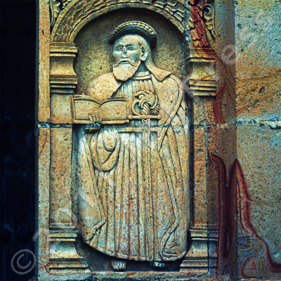 The opposite jamb depicts Saint Paul (San Pablo), similarly dressed, holding his letters and the sword, point down, that he was beheaded with.