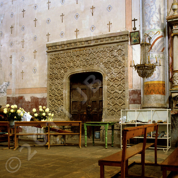 In the nave of the church dedicated to Saint Michael (San Miguel) the door that opens to the cloisters is encased with a massive stone frame covered in Mudejar carving of the mid 16th century.