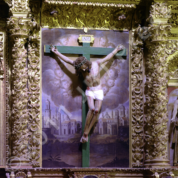 Christ hangs from the cross in front of a view of Jerusalem or the Holy City of God.