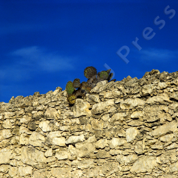 The rough stone wall is home to cactus and provides meaning to the place name of Laguna Seca (Dry Lagoon).