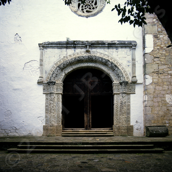 The tequitqui carving around the door as well as the alfiz enclosing the arch, mark the early date of 1536 for the founding of Our Lady of Loreto (Nuestra Señora de Loreto).