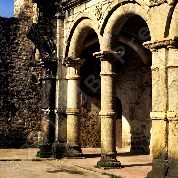In the ruined cloisters the base, columns and capitals have strange belts of ball-like decorations. While the spherical elements are used on other early columns (Acolman) the belts around the shafts is unique.
