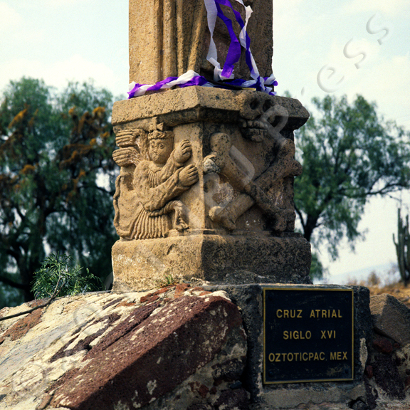 The base of the 16th century cross is decorated with a skull and crossed bones as a remembrance of Calvary and angels whose fluttering robes indicate flight. The cross of the former monastery of Saint Nicholas (San Nicolás) stands outside the current atrio.