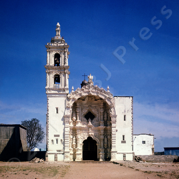 The 1693 church of Saint Nicholas (San Nicolás) uses the popular Baroque of this area of Tlaxcala and Puebla to create an icing like froth on the façade.