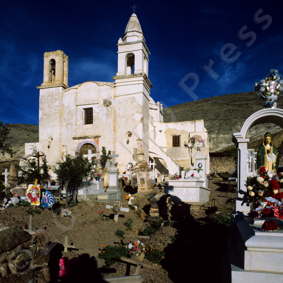 The mining town of Real de Catorce (Royal Fourteen) takes its name from the main silver mine of the area. Now a ghost town and tourist destination, the ghosts are honored with flowers on the graves in the barren yard in front of the 19th century Temple off Guadalupe.