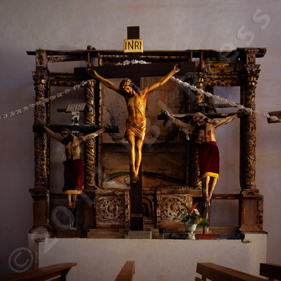 The remains of an altar holds a crucifixion scene of Christ and the two thieves, Dismas (Dimas) and Gestas, who died with him.