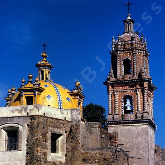 The village of Tonantzingo is the site of one of Mexico’s most famous small churches with an interior covered in painted and gold-leafed stucco decorations with hundreds of angels peering from behind scrolls and foliage The exterior dome and tower are covered in the Puebla style with talavera tiles.