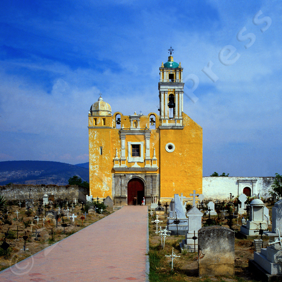The 17th century church Saint Isabel (Santa Isabela) has a simple façade with its churchyard filled with graves and looks like hundreds of other churches in Mexico.