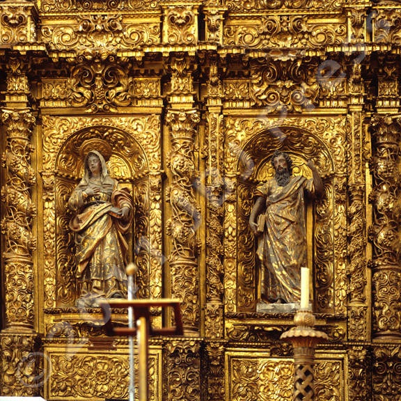 Detail of the altar with two saints in their niches that adorn the church of Saint Louis the Bishop (San Luis Obisbo). The church is from 1585 and the gold-leafed Baroque altar is 17th century.