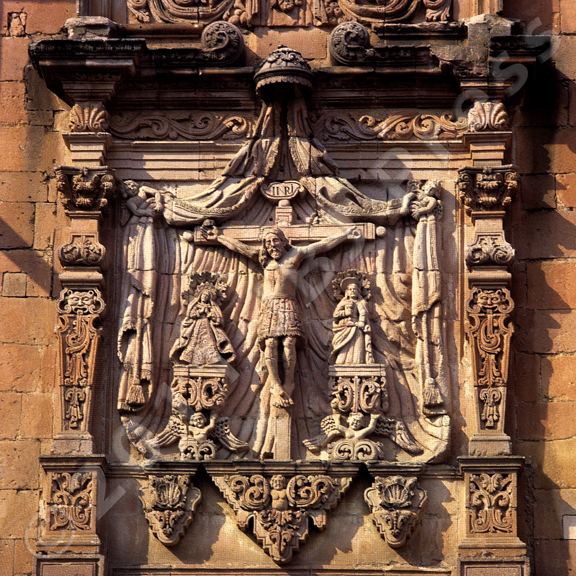 Over a side entrance into the Cathedral of Zacatecas, built in 1730-60 with the wealth produced from the silver mines, is a primitive Baroque interpretation of the crucifixion. Mary and Joseph stand on each side while the draperies are held open by angels and others support pedestals or play entwined in the foliage.